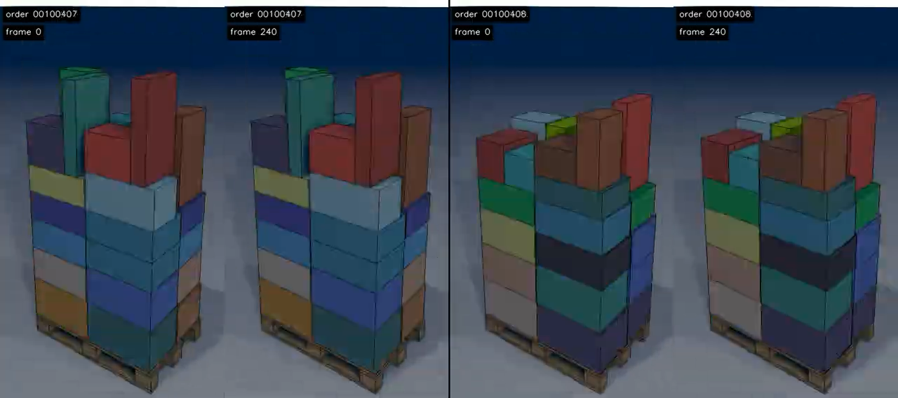 To this end, for each packing plan a stability check in Blender is carried out. The following video shows stability checks for four algorithms for order "00100408".